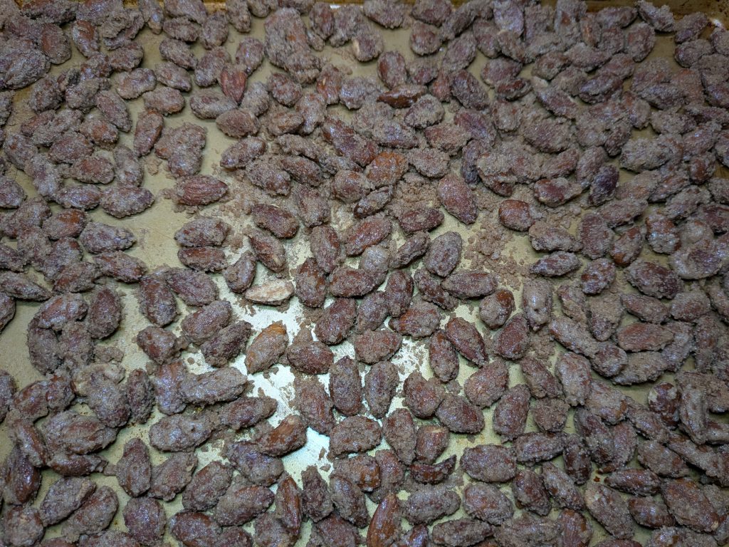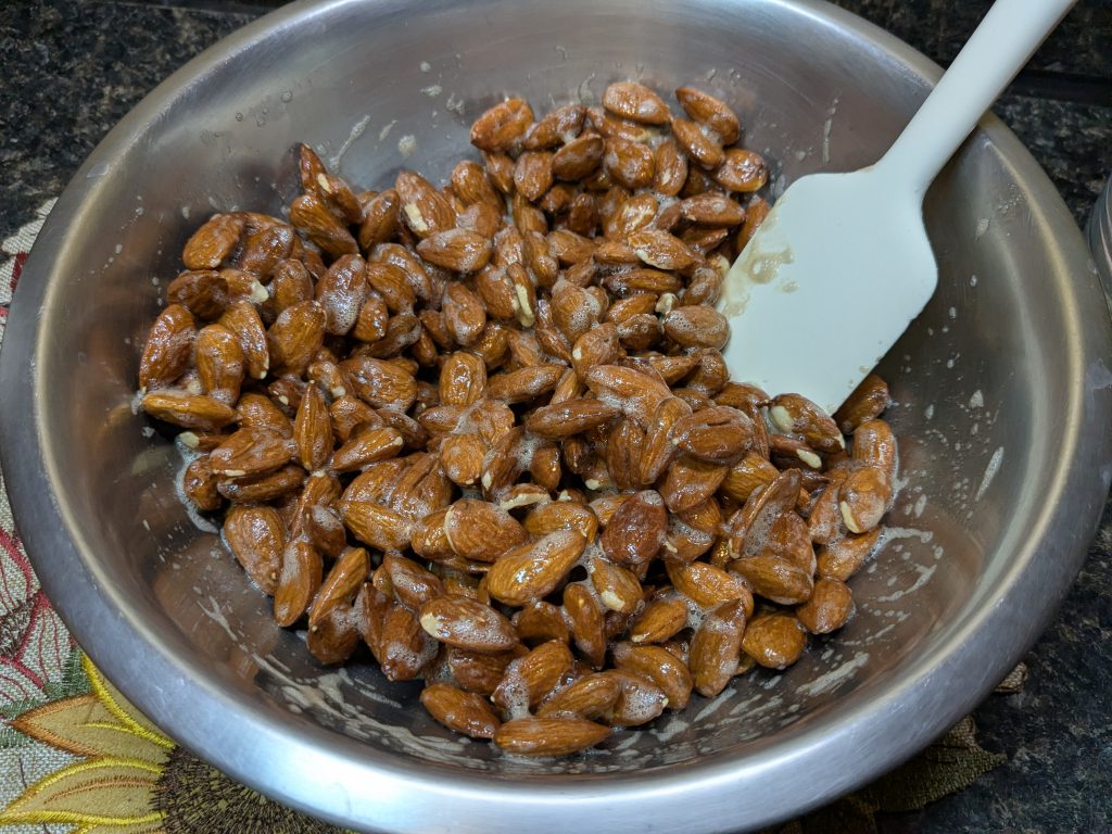 Since the method I’m using doesn’t go all the way to making a caramel, you need some way for the sugar to stick to the nuts. That’s where the egg white comes in. It’s a binder, an edible glue that sticks the sugar mixture to the nuts while you bake them. It works great!