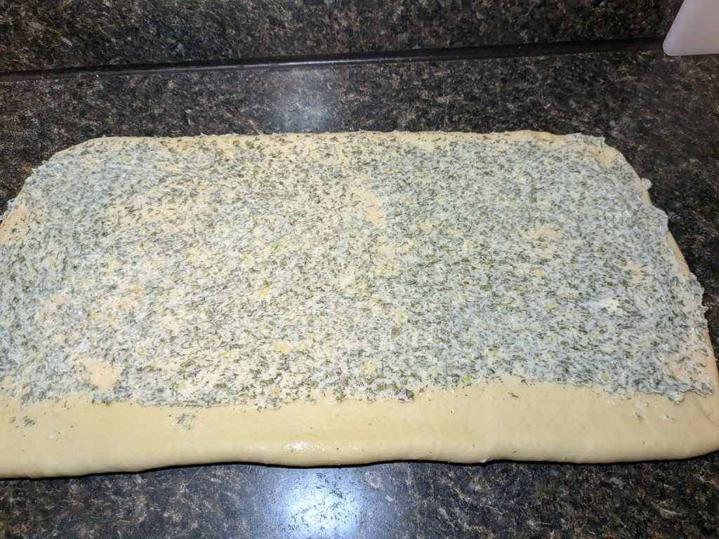 • Spread about ¾ of the butter mixture evenly across the surface of the dough. Mix up your cheeses and spread them evenly on top of the butter, leaving about an inch along one of the long sides of the dough un-cheesed.
