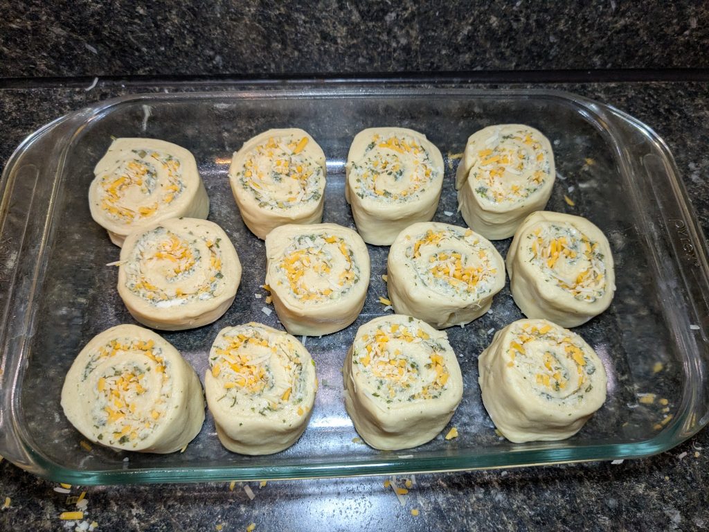 • Arrange the 12 spirals in your baking dish. Cover this and let it rise again for 30-45 minutes. While they're rising, preheat your oven to 375℉.