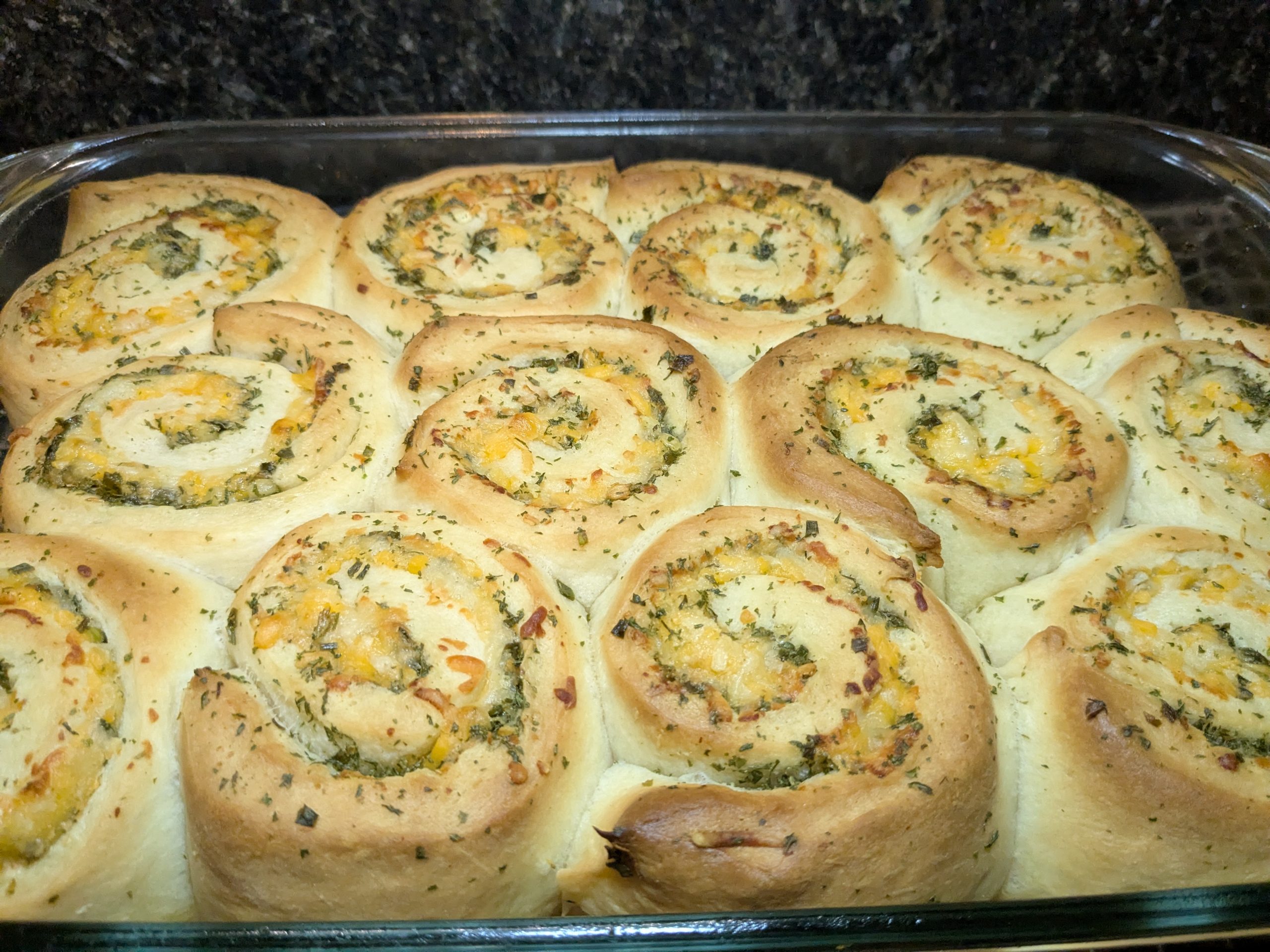 Garlic and cheese rolls made in a similar manner to cinnamon rolls, but savory instead of sweet.