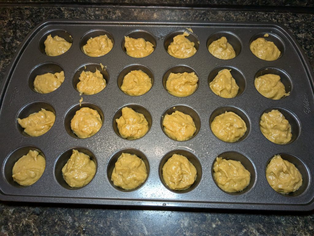 - Using a cookie scoop or spoon, fill the muffin wells about halfway up each. This helps them stay donut holes rather than mini muffins.
