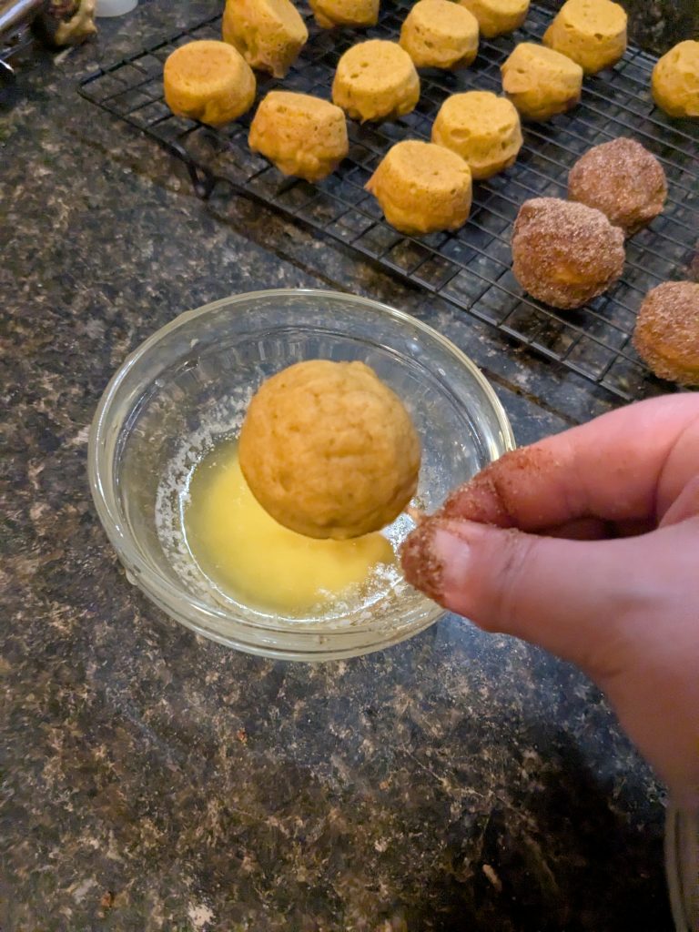 - Melt your butter and in another bowl, mix in the cinnamon and sugar. Dip each donut hole in butter, then roll in cinnamon-sugar to coat. Enjoy!