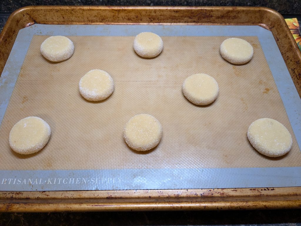 • Roll your dough balls in white sugar and arrange them on your baking sheet, about 2-3 inches apart. They'll spread as they cook. Use a flat-bottomed cup, spatula, or other implement to flatted the balls into discs.