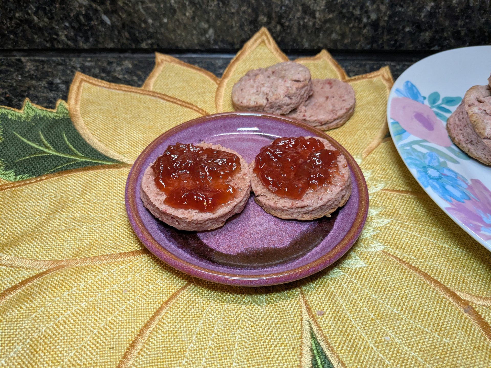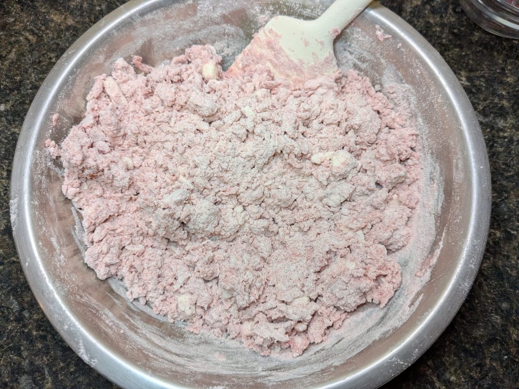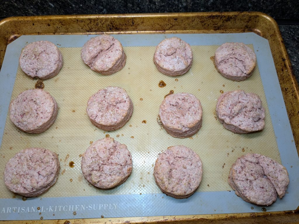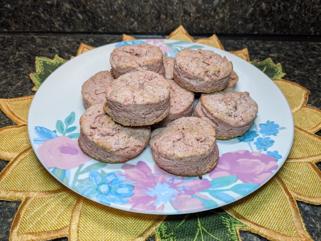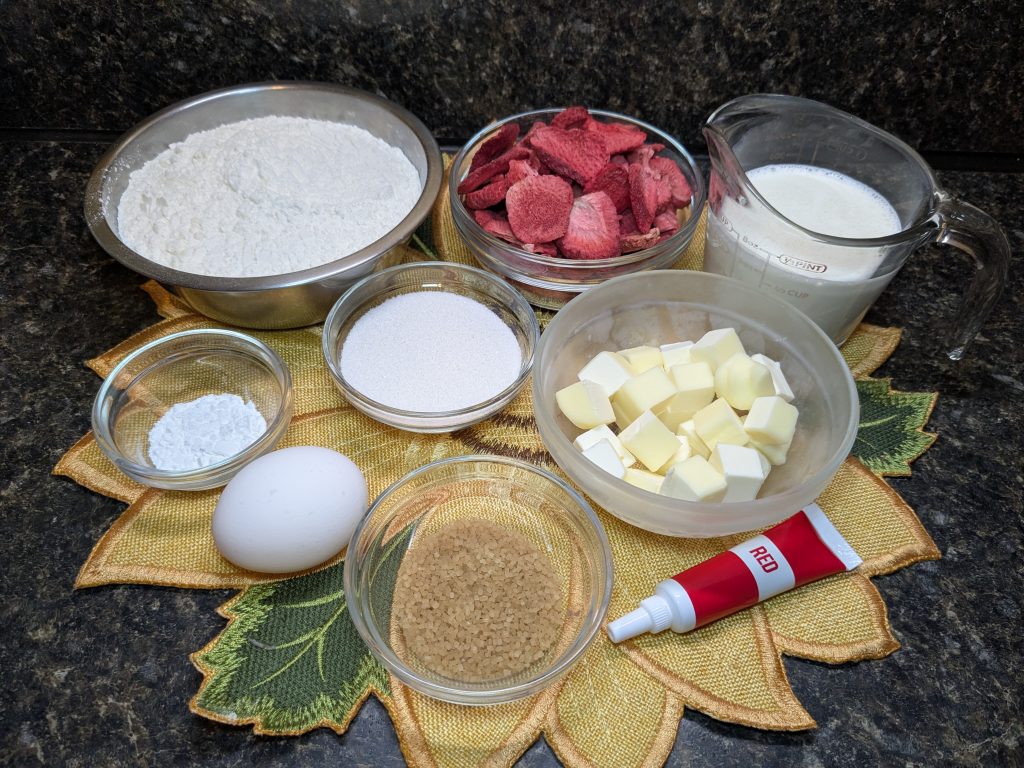 Today’s recipe is a variation on that third one, using freeze-dried strawberries to add color and flavor to the finished product. They’re pink, subtly flavored, and perfect for topping with jam, whipped cream, or even a dollop of ice cream if you want. I’m not here to judge!