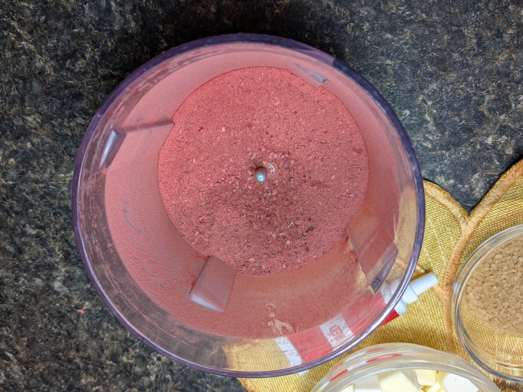 • Preheat your oven to 400℉. Put your silicone mat on your baking sheet. Use the food processor (or a mortar and pestle) to powderize your strawberries.